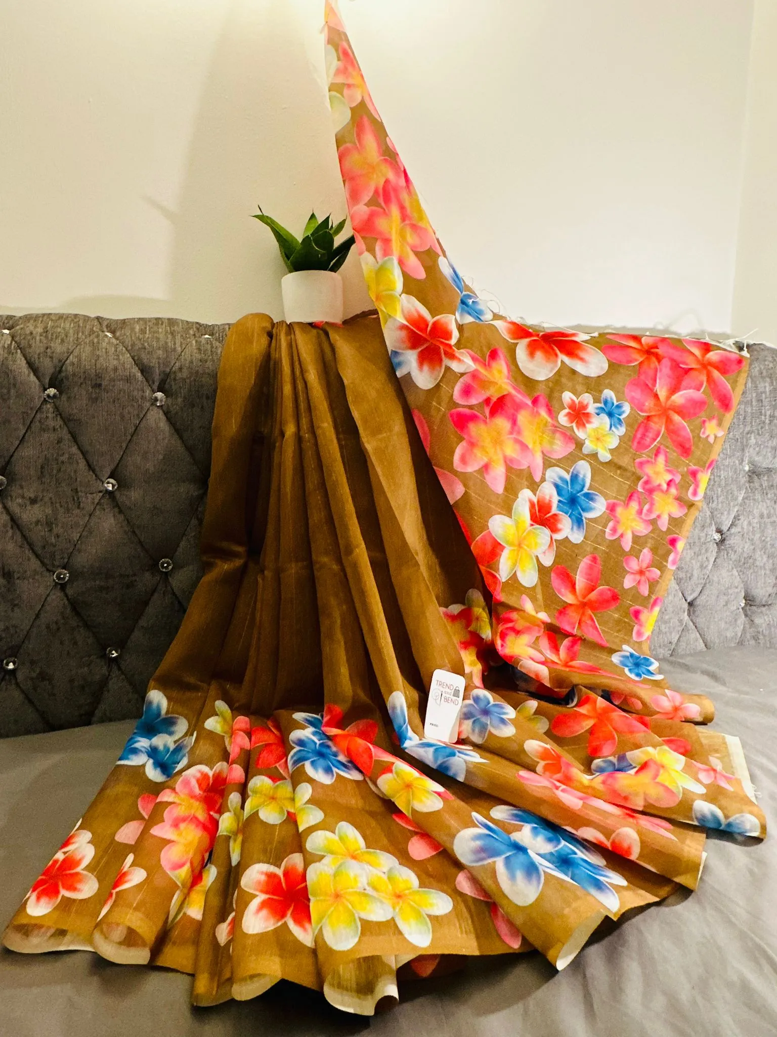Spring Special Brown and Yellow Floral Digital Luxury Printed Silk Saree