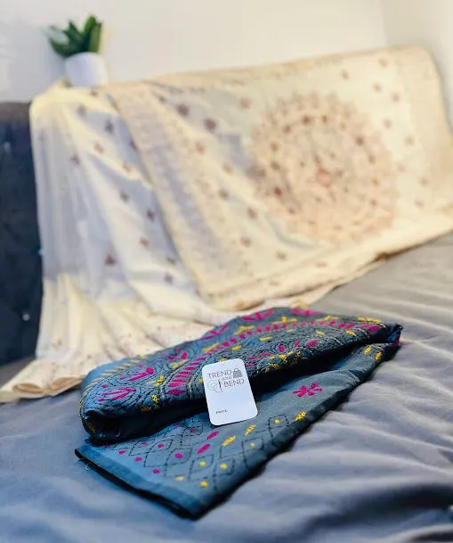 Elegant White and Silver-Grey Hand Kantha Stitch Saree